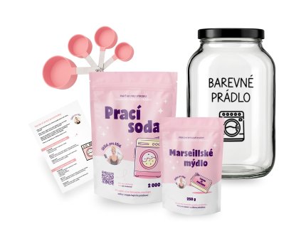 Výhodný balíček obsahuje sadu na výrobu pracího prášku na bílé, barevné a tmavé prádlo a další pomocníky, kteří ti praní parádně usnadní: prací sodu, marseillské mýdlo,...