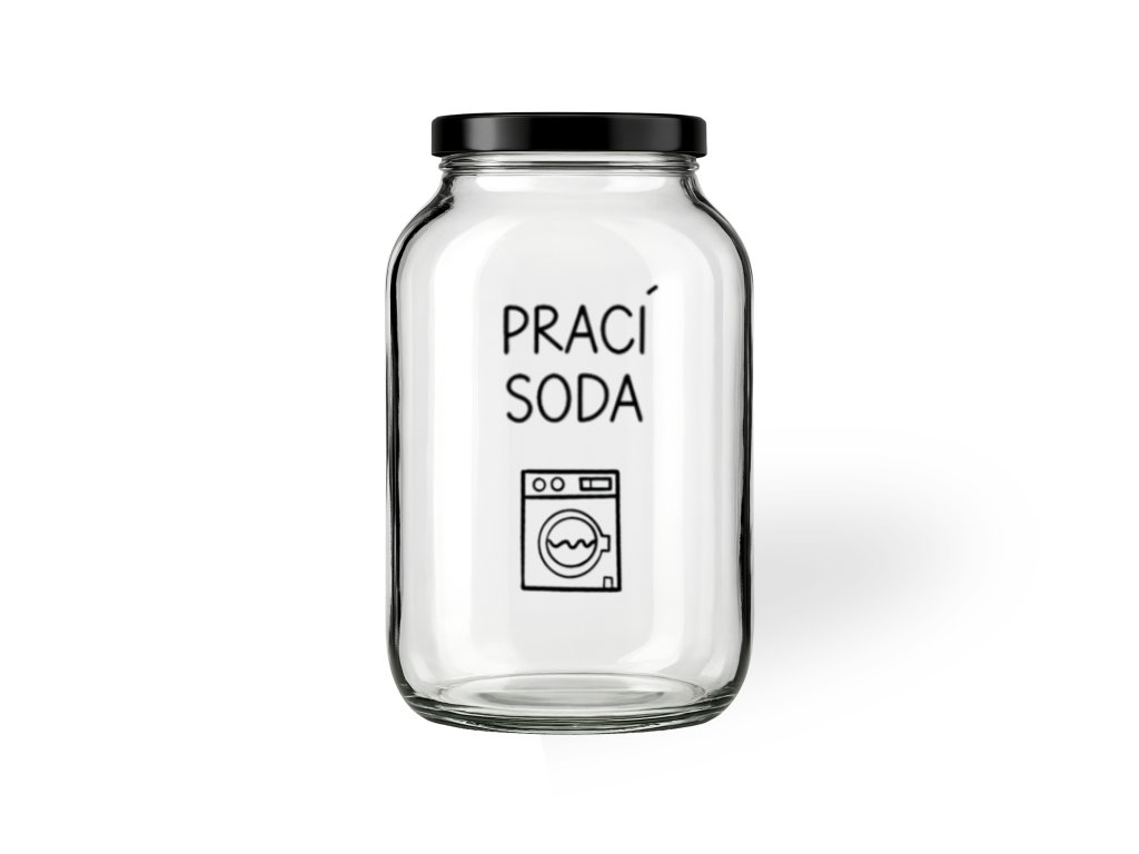 Prací sodu rovnou přesyp do designové sklenice s tiskacím nápisem PRACÍ SODA a koupelna bude hned o chlup stylovější.