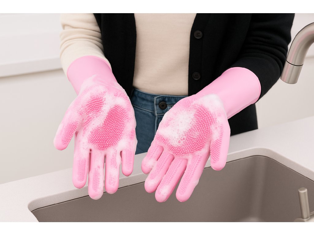 Ahoj, jsme silikonové čisticí rukavice s jemnými štětinami na dlaních. Pomůžeme ti zvládnout mytí nádobí, koupelny a taky třeba ovoce nebo zeleniny. Při úklidu navíc snadno zachytíme i vlasy, chlupy a drobky.