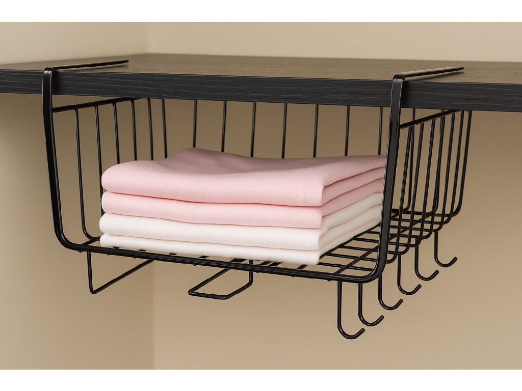 1× kovový závěsný košík pod polici s 5 háčky (rozměry cca 28 × 25 × 19 cm)