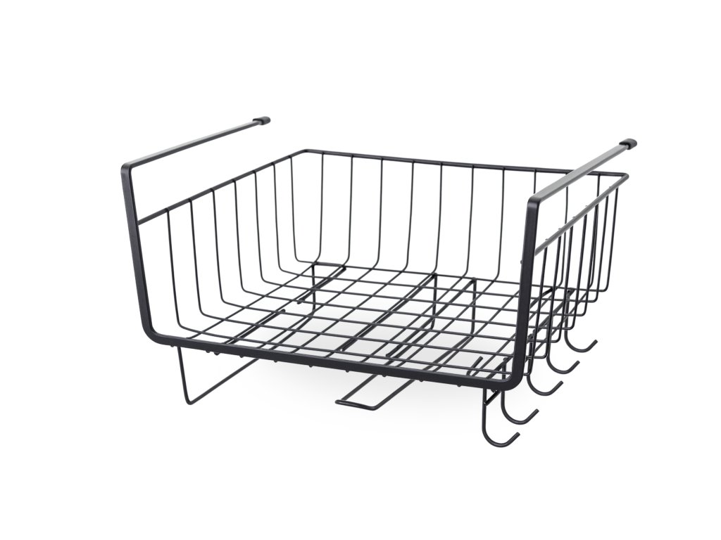 Jsem šikovný kovový košík, který zavěsíš pod poličku nebo polici a hned máš o patro navíc. Navíc ti nabídnu i pět praktických háčků – na hrnky, utěrky nebo třeba kuchyňské náčiní.