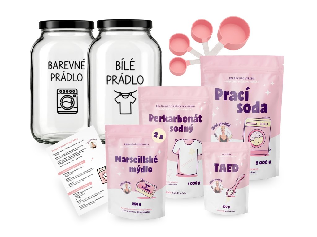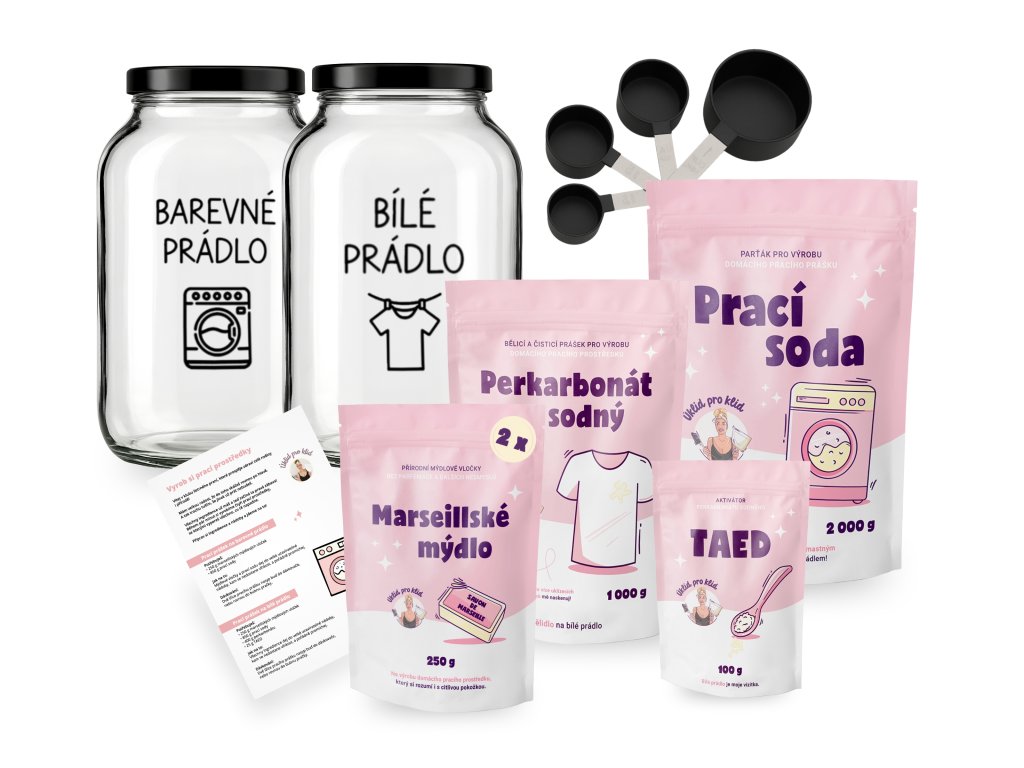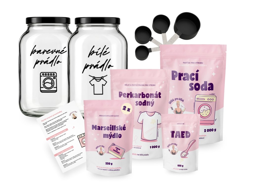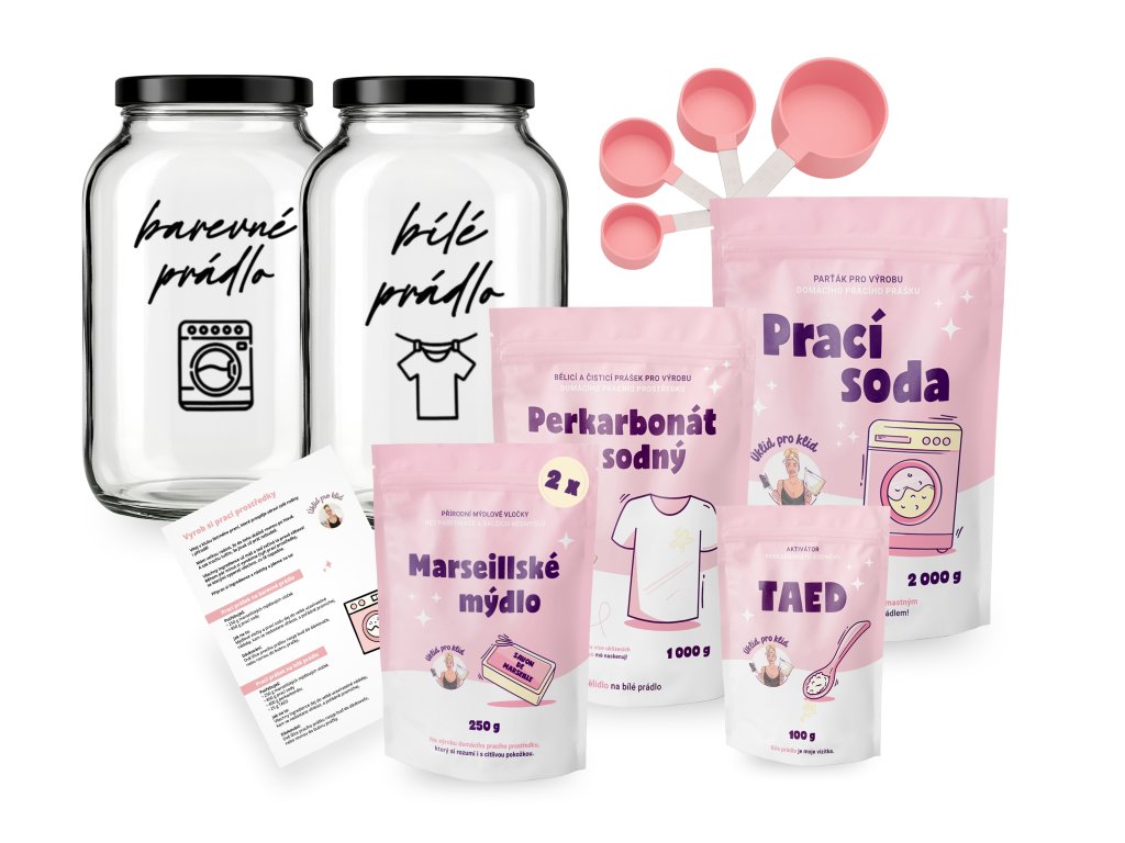 Chceš mít dokonale pod kontrolou, v čem pereš vaše oblečení, které si dáváte na holou kůži? Prát jednoduše a šetrně k vašemu zdraví i přírodě? S tímto výhodným balíčkem během chvilky vyrobíš vlastní prací prášek na bílé a barevné + tmavé prádlo. A ještě si usnadníš praní s dalšími super pomocníky.