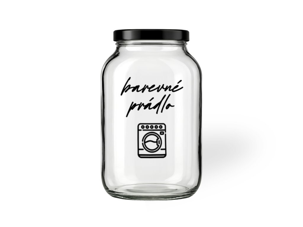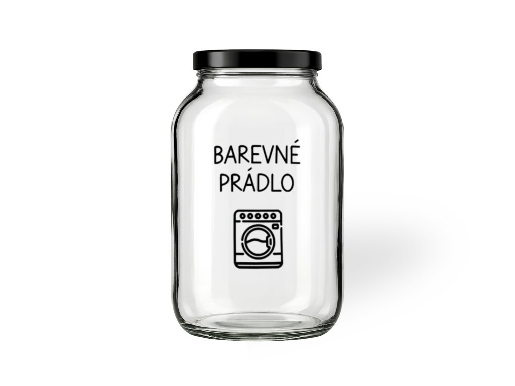 Sklenice na prášek na barevné prádlo má objem 3,68 litrů, výšku 25,3 cm a průměr 15,5 cm a černé šroubovací víčko.