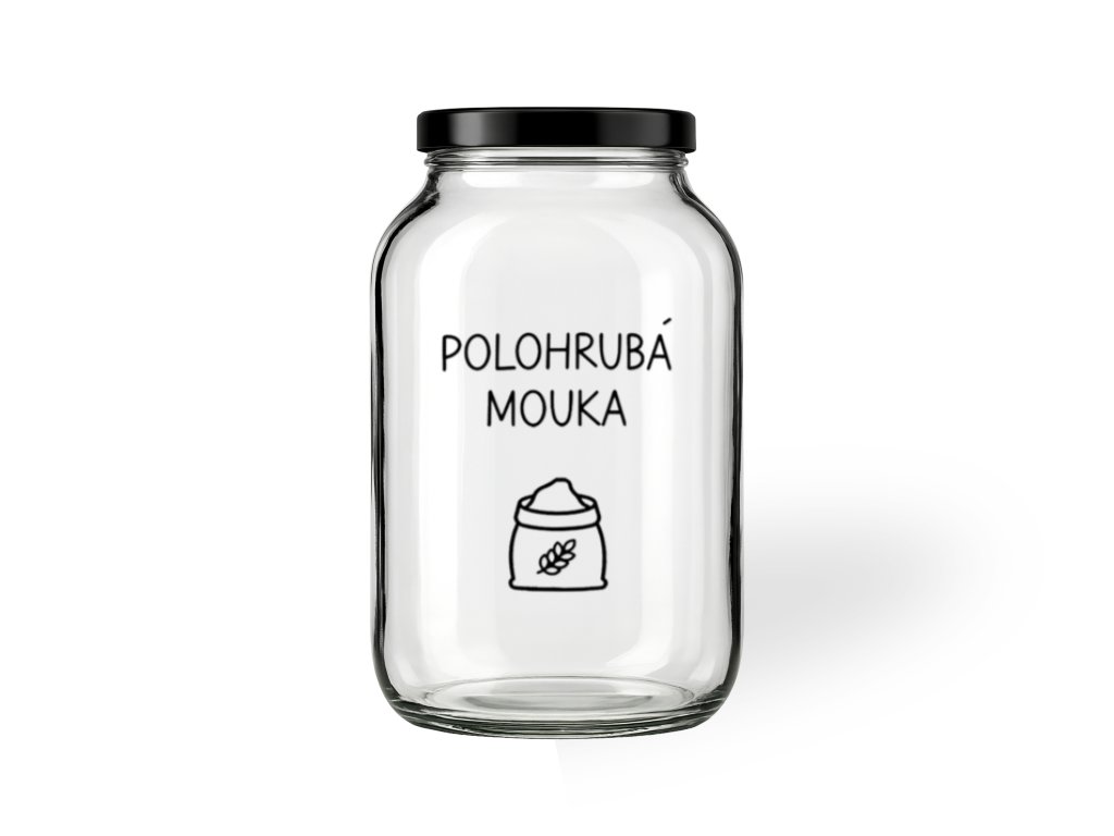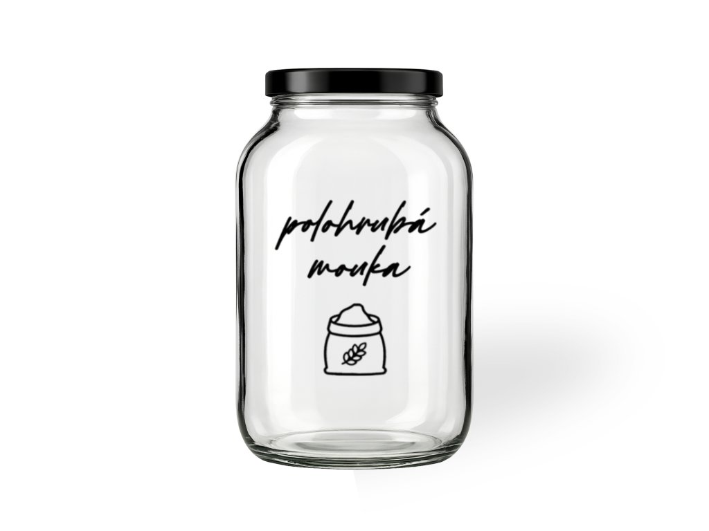 Sklenice s nápisem Hladká mouka o objemu 2 litry a 3,68 litrů – pro bezpečné uskladnění a krásně sladěnou kuchyň.