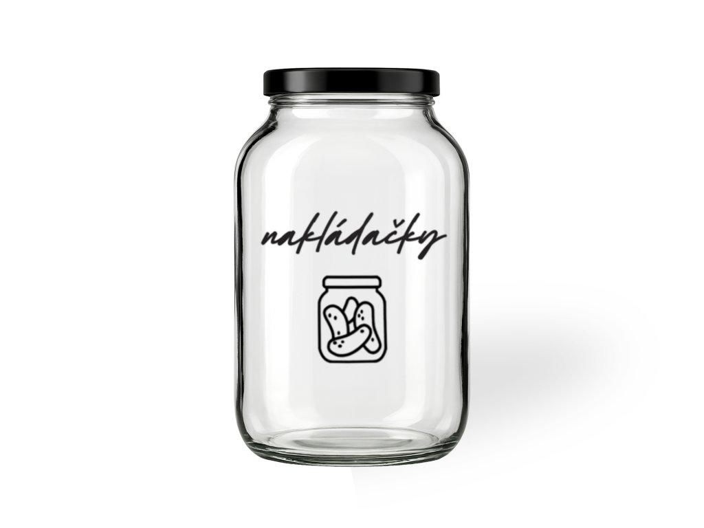 Sklenice na nakládačky má objem 3,68 litrů, výšku 25,3 cm a průměr 15,5 cm a černé šroubovací víčko.
