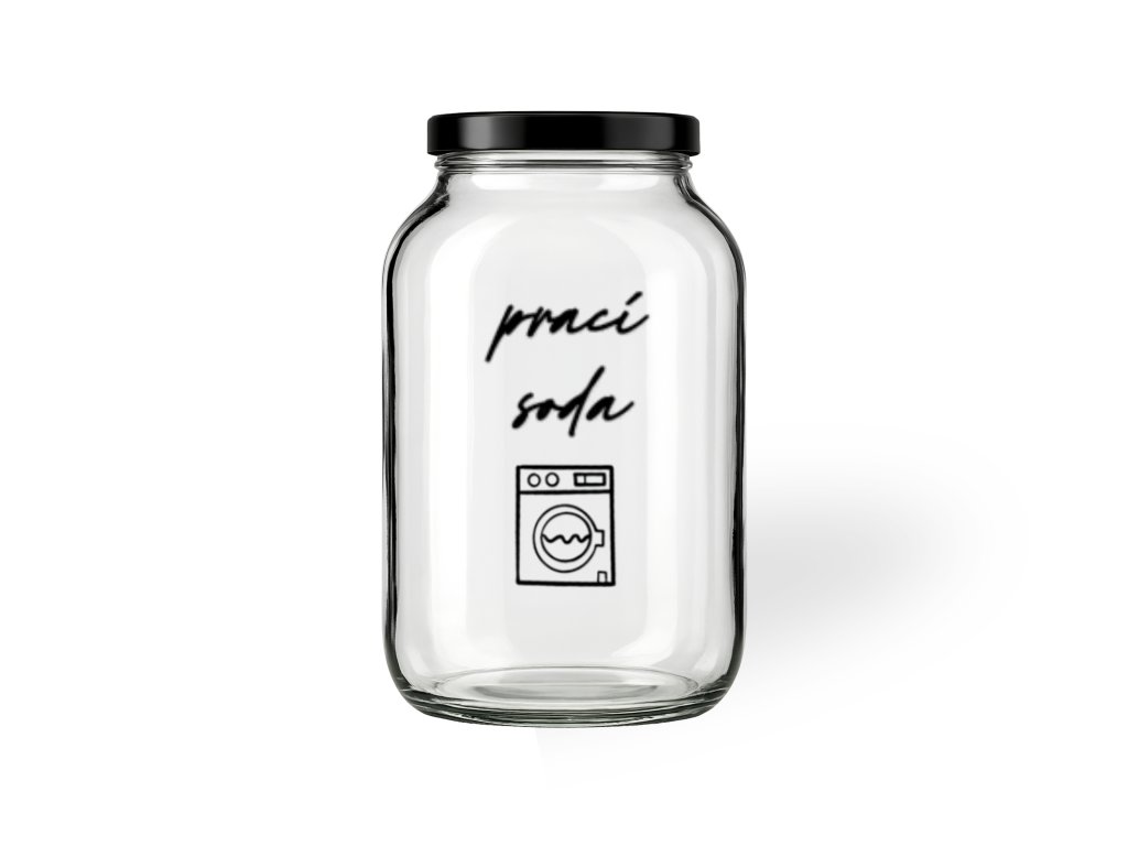 Sklenice na prací sodu má objem 3,68 litrů, výšku 25,3 cm a průměr 15,5 cm a černé šroubovací víčko.