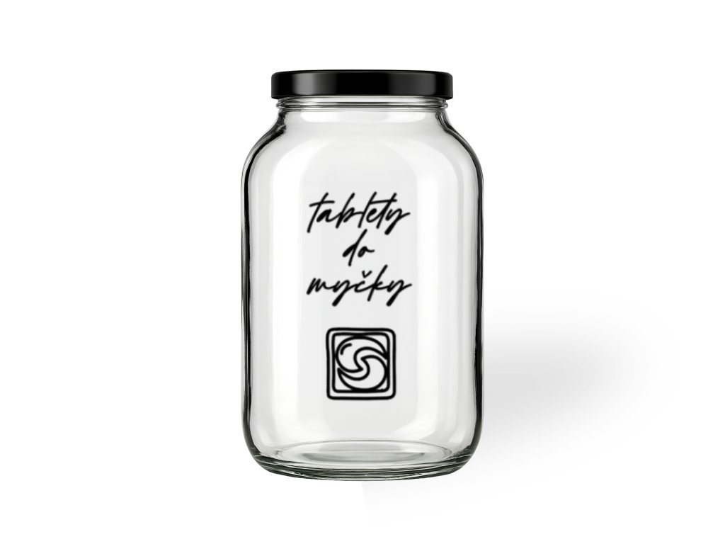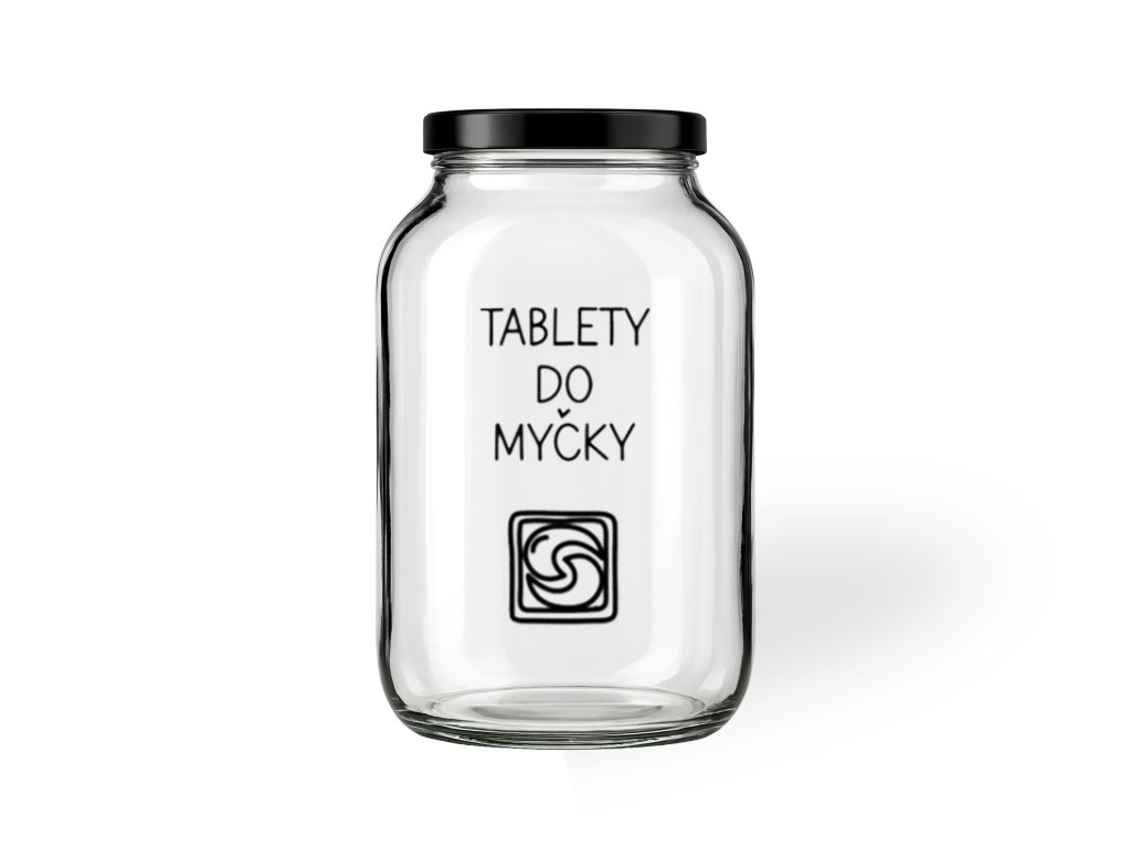Sklenice na tablety do myčky má objem 3,68 litrů, výšku 25,3 cm a průměr 15,5 cm a černé šroubovací víčko.