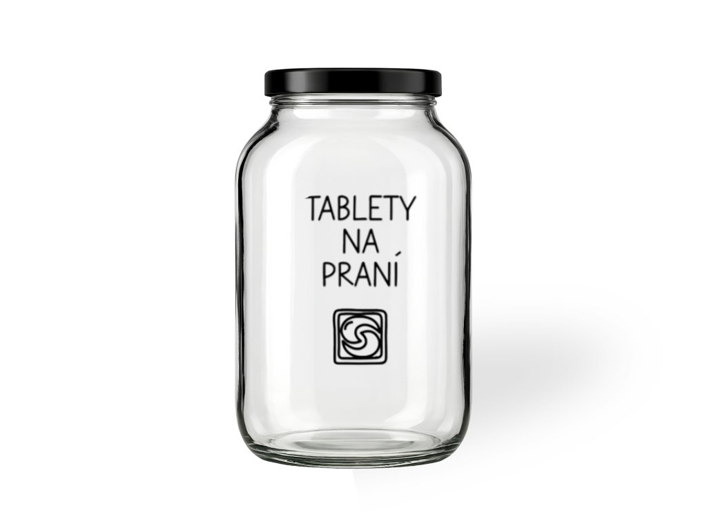 Sklenice na tablety na praní má objem 3,68 litrů, výšku 25,3 cm a průměr 15,5 cm a černé šroubovací víčko.